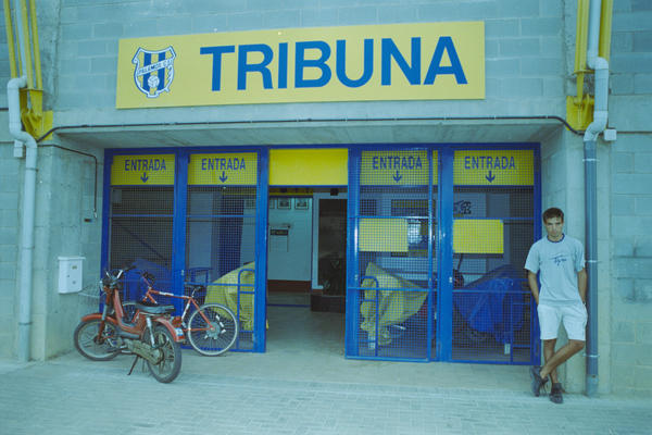 Retrat de Joaquim Hortal, president del Palamós FC al seu despatx. Passadissos de l'estadi del club amb fotografies antigues i entrada a la tribuna amb un aficionat i dues motocicletes.
