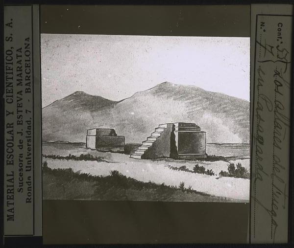Il·lustració dels dos sòcols quadrats de pedra calcària del recinte sagrat de Pasargada a l'Iran, probablement relacionats amb un ritual del foc (600¿530 aC); encara que es desconeix com es van ser utilitzats, es creu que el que es troba en primer terme, que consta de diversos esglaons, actuaria com un podi per veure el foc encès en el del fons.
