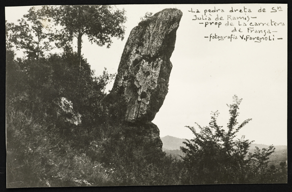 Vista de la desapareguda Pedra Dreta de Sant Julià de Ramis, situada prop de la carretera de França, a l'emplaçament on fou descobert un jaciment arqueològic del paleolític l'any 1965.