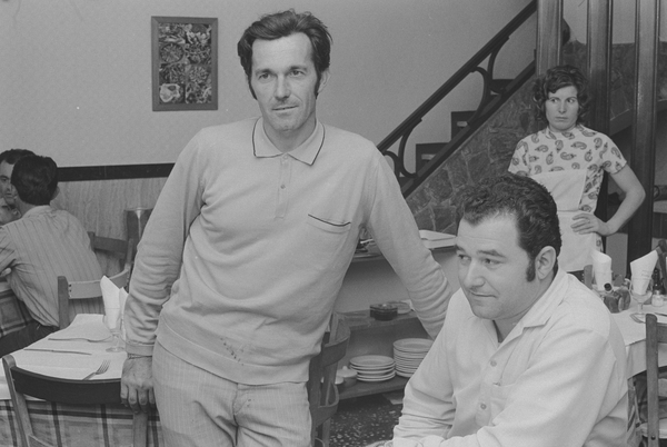 L'Escala. Enquesta flash i Restaurant el Golf (Raphael). Retrats de mig cos, dos nois i dues noies. Imatges de l'interior d¡un restaurant amb el personal de cambrers i propietaris darrera la barra i servint peix en una taula de comensals. Retrat d'un home al mig del menjador d'un restaurant amb gent asseguda a les taules.