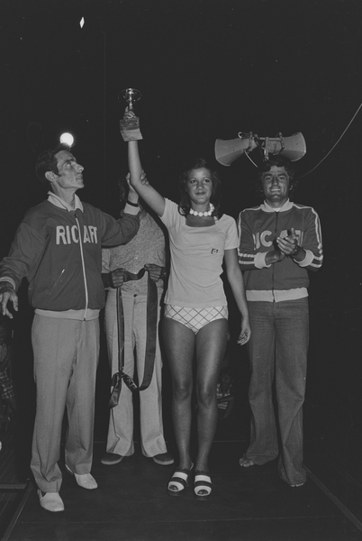 Activitats diverses d'animació al camping Riembau de Platja d'Aro. Retrats de turistes, grups de participants i públic assistent a diferents activitats: competicions esportives, entrega de premis, etc.