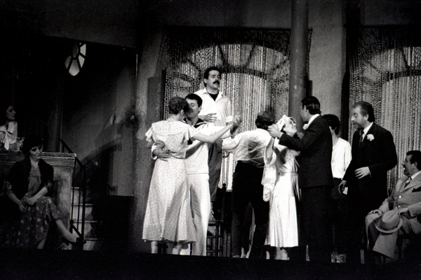 Representació de l'obra de teatre "El Café de la Marina" de Josep Mª de Segarra, escenficat pel Centre Dramàtic, per inaugurar el Teatre el Jardí de Figueres.