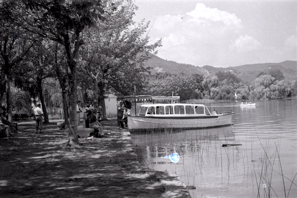 Barca amarrada a la vora de l'estany. Un home agafa pel braç a un altre i l'ajuda a baixar. Alguna gent encara es a dintre, i d'altra està a fora asseguda en un banc o dempeus. La barca porta una bandera d'Espanya. Al darrere, hi ha una altra barca més petita on hi ha tres persones. Al voltant, tot d'arbres i muntanya.
