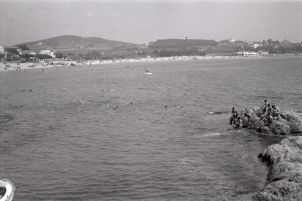 A la dreta, hi ha unes roques on hi ha gent asseguda o dempeus. Al mar hi ha gent banyant-se o amb barca. Al fons, hi ha tot de cases, arbres i muntanyes.
