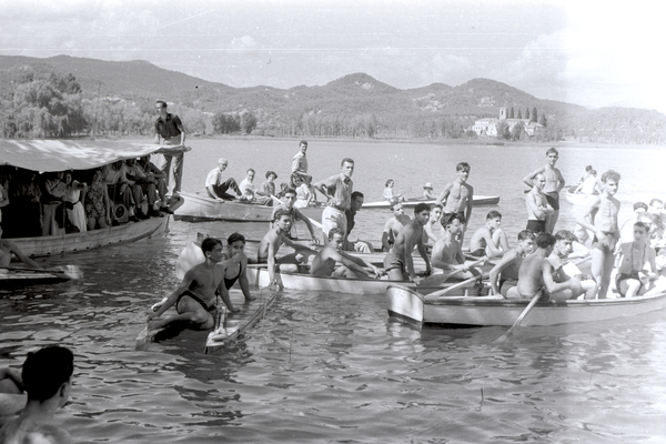 7a Travessia de l'Estany de Banyoles. Nedadors durant la cursa, públic assistent a l'acte, les pesqueres i gent passejant a peu o en bicicleta, al fons.