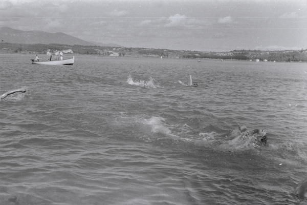7a Travessia de l'Estany de Banyoles. Nedadors durant la cursa, públic assistent a l'acte, les pesqueres i gent passejant a peu o en bicicleta, al fons.