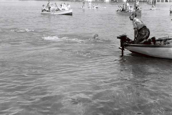 7a Travessia de l'Estany de Banyoles. Nedadors durant la cursa, públic assistent a l'acte, les pesqueres i gent passejant a peu o en bicicleta, al fons.