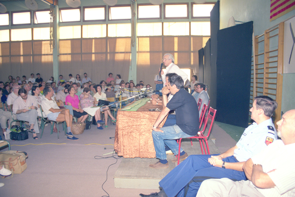 Acte d'inauguració de la XXIII Universitat Catalana d'Estiu al Liceu Renouvier de Prada: xerrada de l'equip rector: el vicepresident Josep Lluís Carod-Rovira i el president Enric Casasses, l'alcalde de Prada, Paul Blanc, i el conseller del Consell general dels Pirineus Orientals, Jean Luc Male.