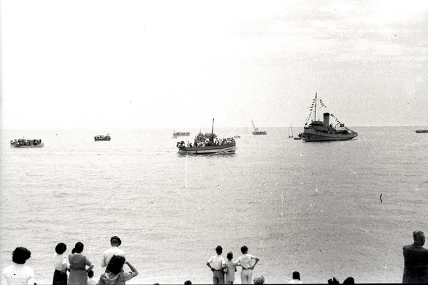 Celebració de la processió marítima de Santa Cristina. Vaixells engalanats amb banderoles, grups de gent a la platja observant els vaixells i la processó marítima. Processó i aplec a l'ermita de Santa Cristina, amb els sacerdots i autoritats celebrant la missa, la imatge de Santa Cristina i la relíquia.