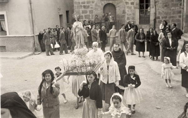 Processó a la plaça Catalunya. En primer terme, dones portant la imatge d'una verge. En segon terme, Josep Ferriol Carreras, capellà, i al fons, homes i dones caminant en processó.