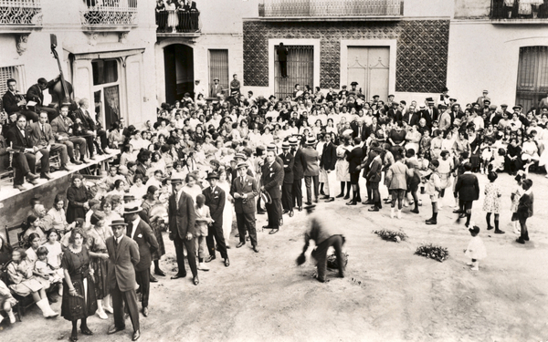 Dansaires ballant el Ball de les Morratxes en una plaça de Lloret de Mar. En primer terme, un home recollint rams de flors de terra. En segon terme, gent al voltant de la plaça. A l'esquerra, músics de cobla sobre una tarima.