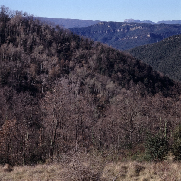 Feixes abandonades, tremoleda a primer terme i alzinars al fons. Al penúltim horitzó s'estén la serra de Les Medes i, darrere de tot, es retallen Aiats i Cabrera.