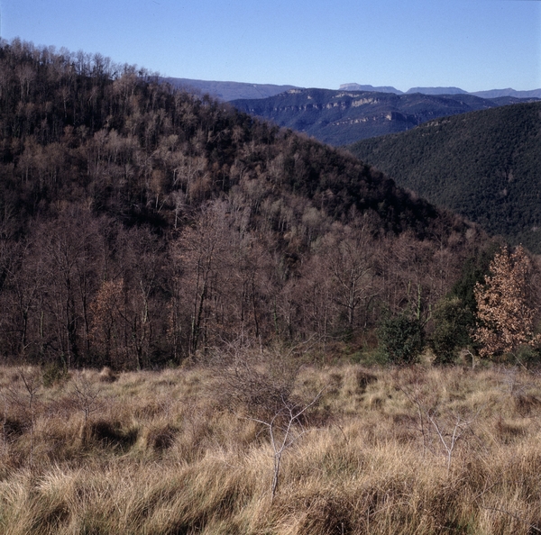 Feixes abandonades, tremoleda a primer terme i alzinars al fons. Al penúltim horitzó s'estén la serra de Les Medes i, darrere de tot, es retallen Aiats i Cabrera.