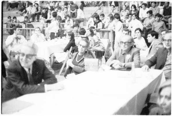 Taula d'assistents a l'acte de concessió del III Premi Prudenci Bertrana. A l'esquerra, Maurici Serrahima. Al centre, amb un collaret de perles, Aurora Bertrana. A l'altre costat de la taula, a la cantonada, Modest Prats. Al fons, assistents a les grades del Pavelló Municipal d'Esports.
