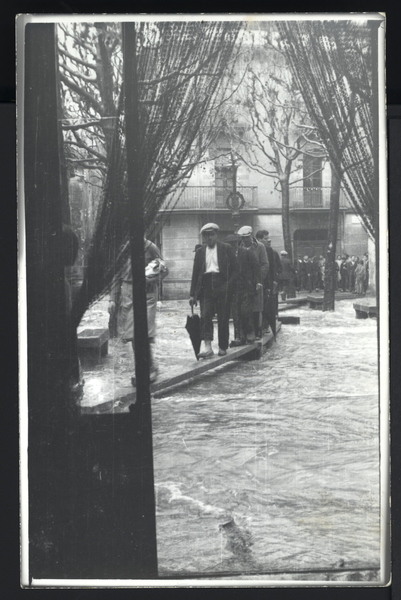 Placeta dels Estudis inundada. Al centre de la imatge, un grup de persones travessant la plaça sobre taulons de fusta. Fotografia feta des de l'interior d'una casa.