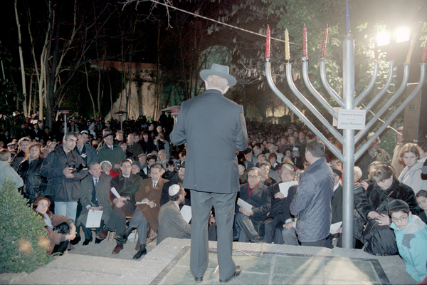 Celebració de la festivitat jueva de la "Hanuka" als Jardins dels Alemanys: cerimònia de recitar les tres benediccions, pregaria, cant del "Maz'oz Tsur" i lectura del salm 30 de David. Cerimònia presidida pel gran rabí Elianhu Bakshi Doron. Acte presentat per Mario Offenberg, director general de la Comunitat Israelita de Berlín, i amb la presència de Carlos Schorr, president de les Federacions Israelites d'Espanya, i de Joaquim Nadal, alcalde de Girona.
