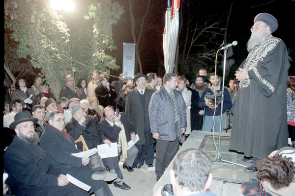 Celebració de la festivitat jueva de la "Hanuka" als Jardins dels Alemanys: cerimònia de recitar les tres benediccions, pregaria, cant del "Maz'oz Tsur" i lectura del salm 30 de David. Cerimònia presidida pel gran rabí Elianhu Bakshi Doron. Acte presentat per Mario Offenberg, director general de la Comunitat Israelita de Berlín, i amb la presència de Carlos Schorr, president de les Federacions Israelites d'Espanya, i de Joaquim Nadal, alcalde de Girona.