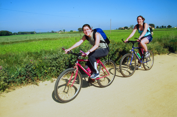 Imatge en primer pla de dues noies somrient i circulant en bicicleta per la Via Verda de la Ruta del Carrilet, al seu pas per Quart. Al fons, es veuen alguns camps de conreu.