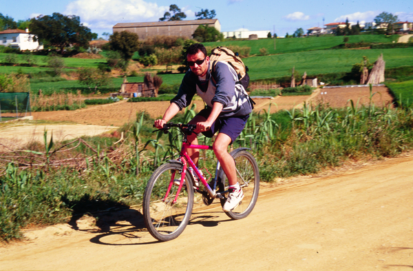 Imatge en primer pla d'un home circulant en bicicleta, amb una motxilla i ulleres de sol, per la Via Verda de la Ruta del Carrilet. Darrere seu es veuen alguns camps de conreu.