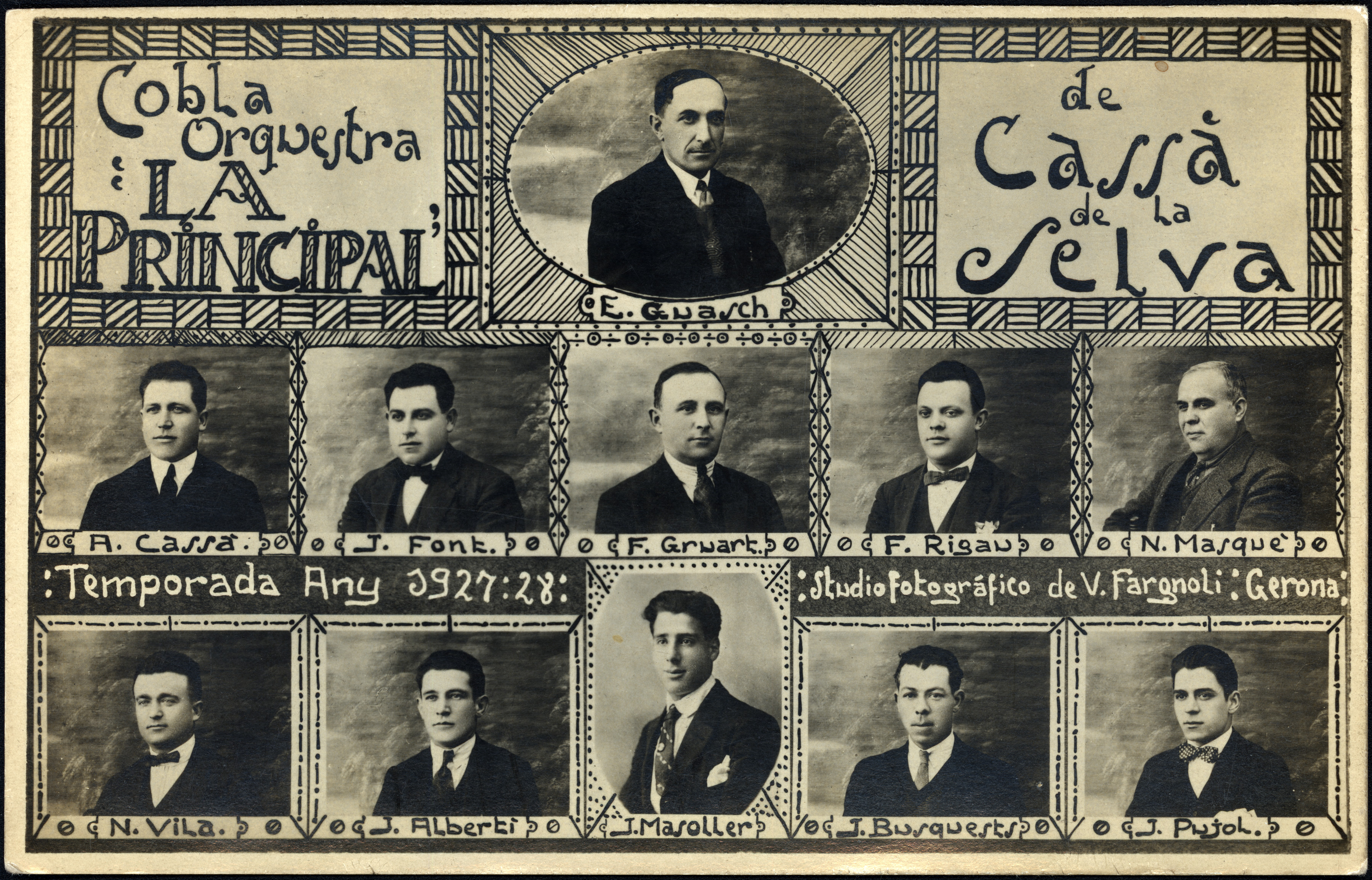 Orquestra-cobla "La Principal" de Cassà de la Selva Codi IF-58810 Fons Fons i col·lecció Emili Massanas i Burcet Autor Fargnoli Iannetta, Valentí Data 01/01/1927 - 31/12/1928 Descripció Músics que formen l'orquestra-cobla "La Principal" de Cassà de la Selva. Personatges E.Guasch, A. Cassà, J.Font, F.Gruart, F.Rigau, N.Masquè, M.Vila, J.Albertí, J.Masoller, J.Busquets, J.Pujol Municipi Cassà de la Selva Comarca Gironès Detentor de drets Autor a domini públic Crèdit FARGNOLI IANNETTA, Valentí. Fons i col·lecció Emili Massanas i Burcet. INSPAI. Diputació de Girona. Llicència Aquesta obra està subjecta a una llicència de Reconeixement-NoComercial-SenseObraDerivada 4.0 Internacional de Creative Commons. Afegeix a la cistella ANTERIOR SEGÜENT