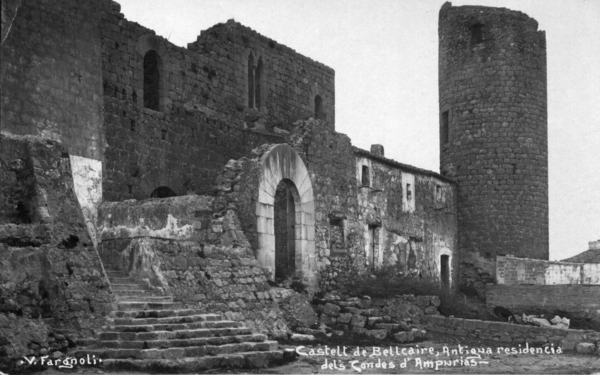Façana principal del castell-palau dels comptes d'Empúries a Bellcaire d'Empordà. En primer terme, l'escalinata d'accés a l'església i una porta adovellada d'accés a l'edifici. Al fons, una de les sis torres de planta circular que protegien el castell.