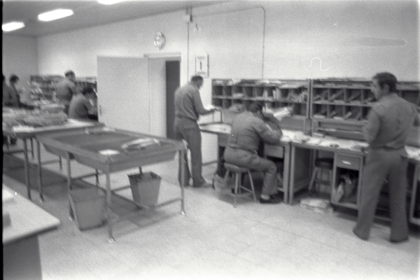 Interior i exterior de la oficina de Correus de Girona, apareixen bústies de paret i bústies de peu retirades pel mal estat, gent que surt de l'oficina, dos carters al carrer i el departament de distribució. Entrevista del periodista Jaume Planas al responsable de correus.