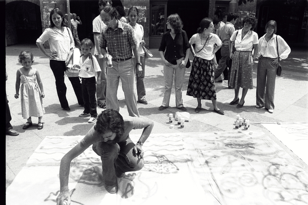 "Happening" esdevingut a la Rambla de Girona amb motiu d'una campanya ecològica i ciutadana en defensa de l'Onyar i llurs espècies. S'hi veuen nens dibuixant i Damià Escuder fent una pancarta.
