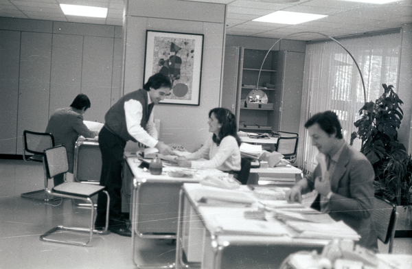 Rètol d'Unió Comtal d'Assegurances, companyia integrada al Grup Assegurador RUMASA. Detall de les oficines i els seus treballadors. Francesc Pérez López, Director d'Unió Comtal d'Assegurances a Girona.