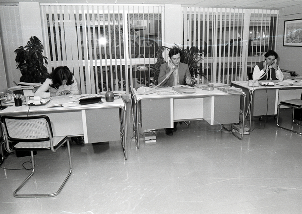 Rètol d'Unió Comtal d'Assegurances, companyia integrada al Grup Assegurador RUMASA. Detall de les oficines i els seus treballadors. Francesc Pérez López, Director d'Unió Comtal d'Assegurances a Girona.