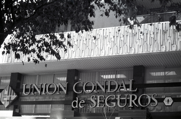 Rètol d'Unió Comtal d'Assegurances, companyia integrada al Grup Assegurador RUMASA. Detall de les oficines i els seus treballadors. Francesc Pérez López, Director d'Unió Comtal d'Assegurances a Girona.
