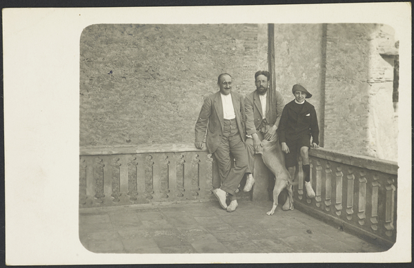 Carles Batlle de Pagès, Moisés Serra Bartolomé i Joaquim Batlle Martínez asseguts a la barana de l'eixida de la casa pairal familiar a Palau de Santa Eulàlia