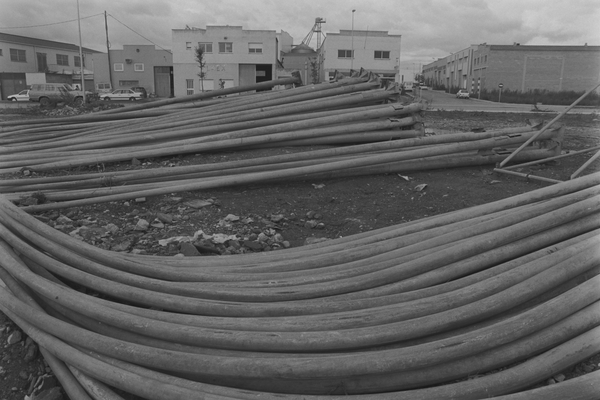 Exterior de l'antic edifici de la a farga de Banyoles, abans de la seva restauració. Mecanisme interior de la farga. Faroles apilades al costat de l'antic molí paparer. Reportage en motiu de la celebració del ·Col·loqui de ia Farga: Banyoles, una mostra excepcional de farga catalana", organitzat pel Centre d'Estudis Comarcals de Banyoles.