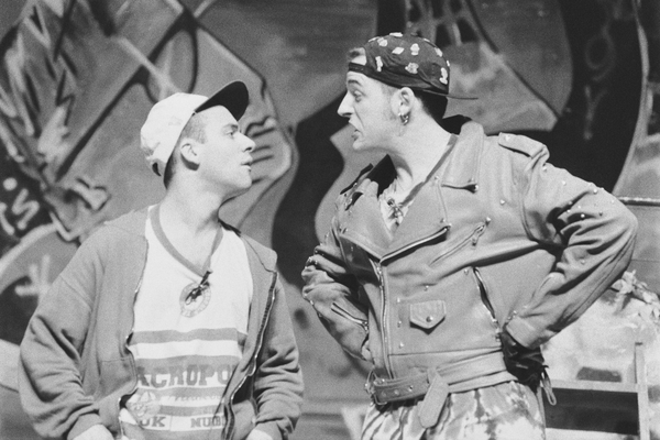 Fàbio León i Javier Gutiérrez, membres de la companyia Teatrarte, durant la representació de l'obra teatral "Otro y yo", dins d'una camanya de la Prefectura Provincial de Trànsit per a prevenir els accidents de trànsit.