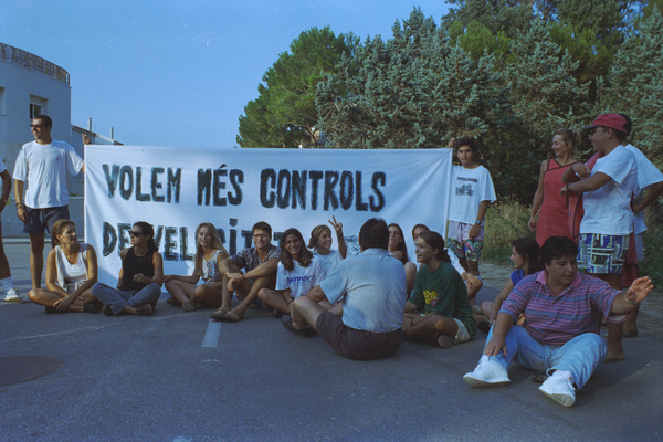 Manifestacio¿ dels vei¿ns de la Fosca en contra de la construcció d'una nova carretera que uneixi l'indret amb Palafrugell, i per la millora del barri. Els veïns tallen el trànsit de diversos carrers i duen una pancarta on hi ha inscrit: "No volem que la Fosca sigui el cinturo¿ de Palamo¿s. La volem neta, tranquil·la i segura".