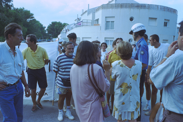 Manifestacio¿ dels vei¿ns de la Fosca en contra de la construcció d'una nova carretera que uneixi l'indret amb Palafrugell, i per la millora del barri. Els veïns tallen el trànsit de diversos carrers i duen una pancarta on hi ha inscrit: "No volem que la Fosca sigui el cinturo¿ de Palamo¿s. La volem neta, tranquil·la i segura".