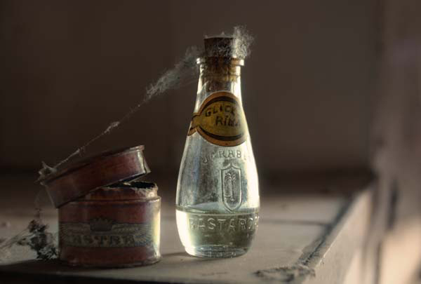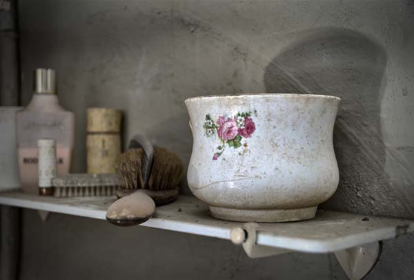 Entre teranyines i tímides llums que s'escolen per les finestres trencades, busco objectes castigats pel pas del temps per rescatar-los de la pols i mostrar la seva bellesa; bellesa tan fràgil com la del mateix silenci que l'envolta.